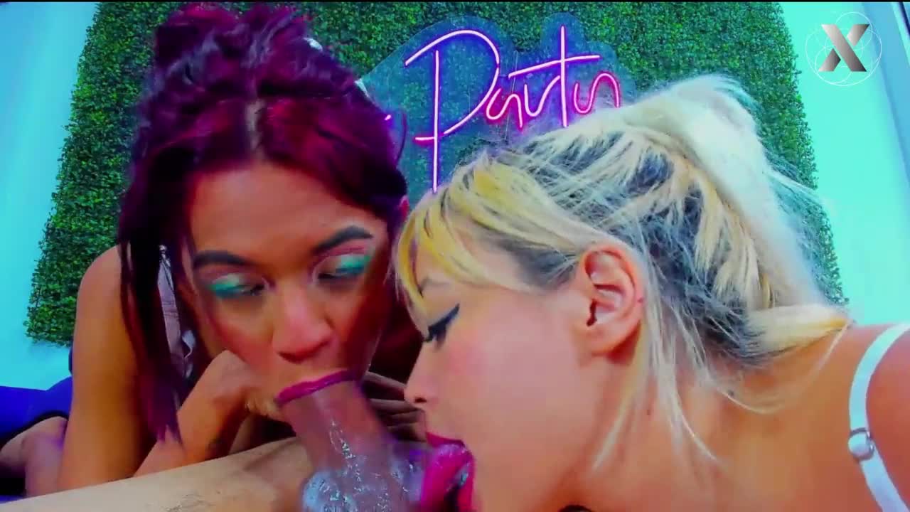 Jasmine and her blonde friend team up to give blowjobs to her best buddy in a wild session.