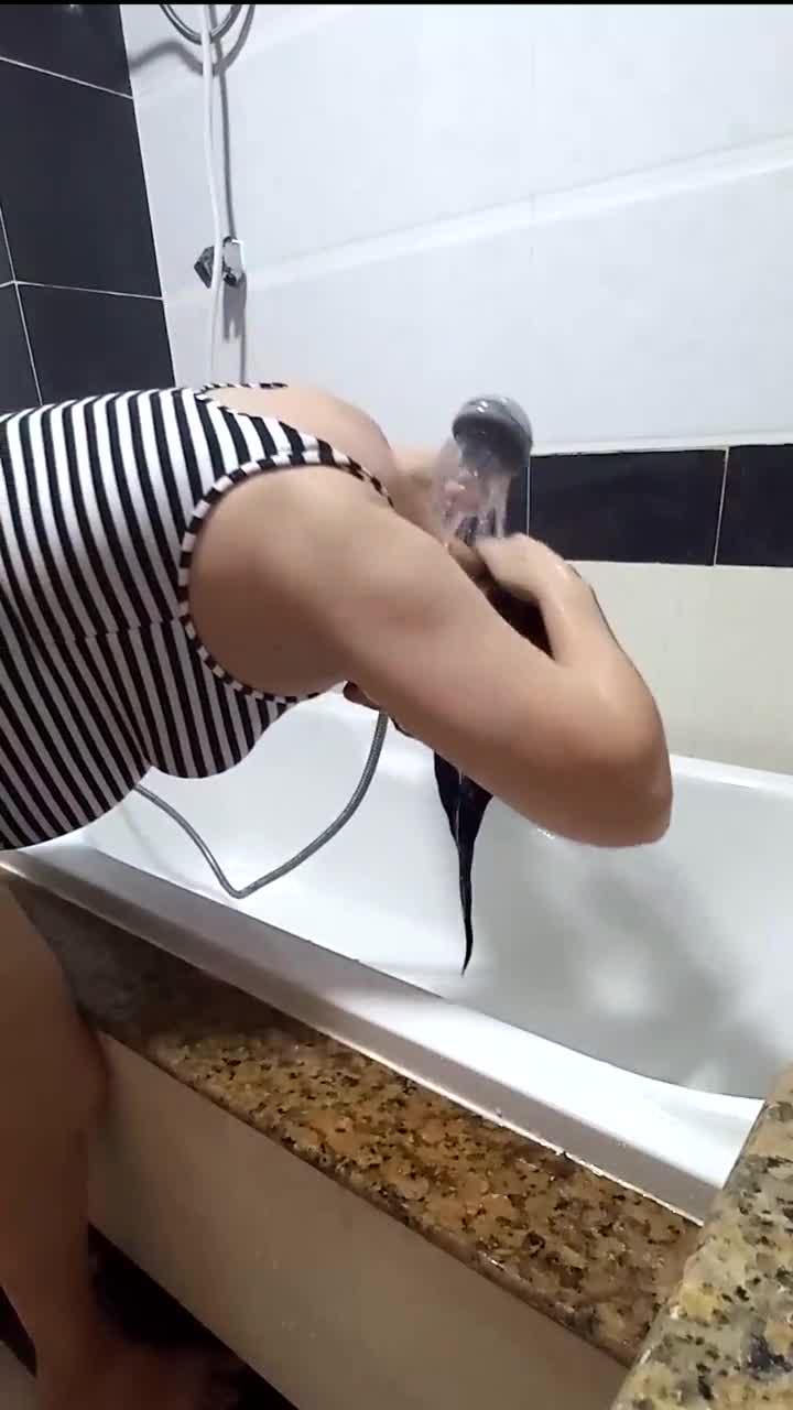 काली मिल्फ लटकी चूचियों वाली कर्ली हेयर वाली स्ट्रैप-ऑन से शॉवर में मैच्योर लेस्बियन दोस्त को चोदती