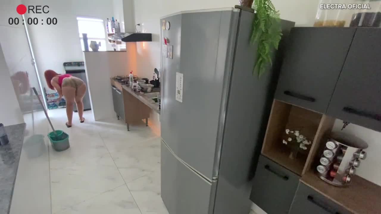 छुपा कैमरा पकड़ता है सौतेली माँ को बड़े प्राकृतिक स्तनों के साथ घर साफ करते हुए